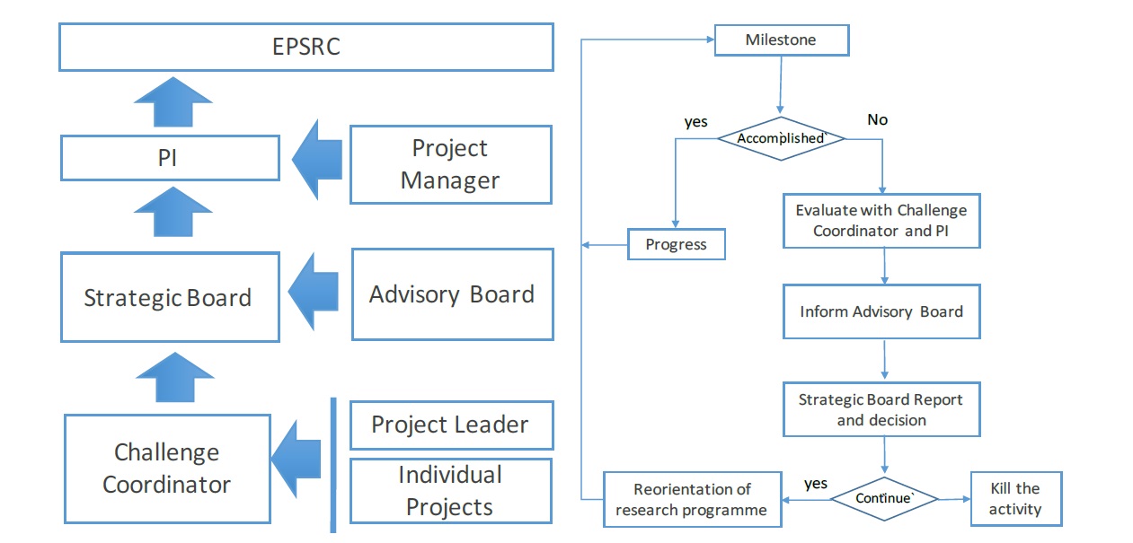 5) The PI will be supported in the day-to-day management and decision making by a 80% FTE Project Manager who will not only report to the PI, make sure that the project stays on track, and that objectives and any deadlines established by the SB are met, but will also act as a focus for impact pathways and advocacy (including public engagement). The PI will report to EPSRC and will have overall responsibility for the grant.